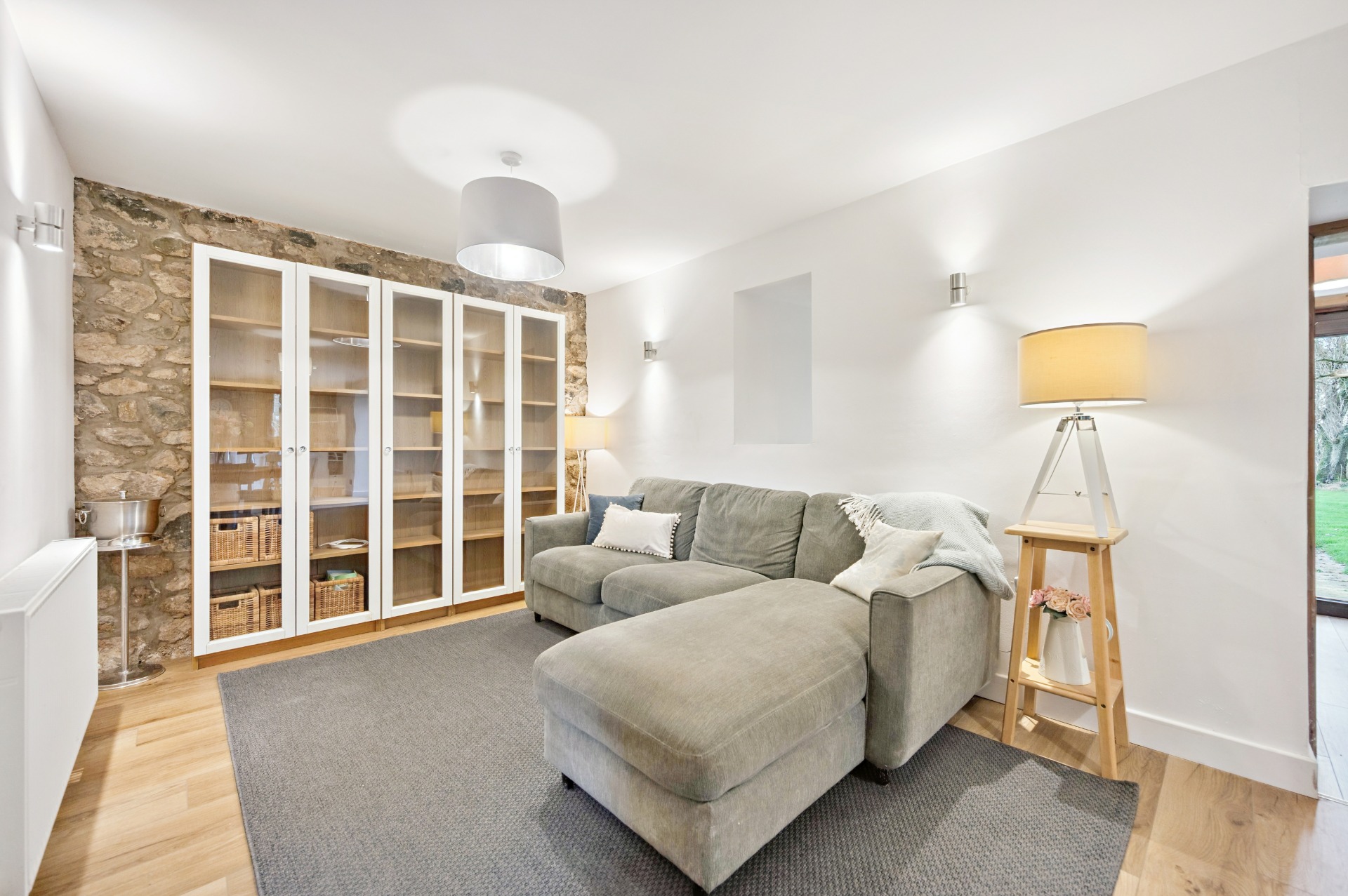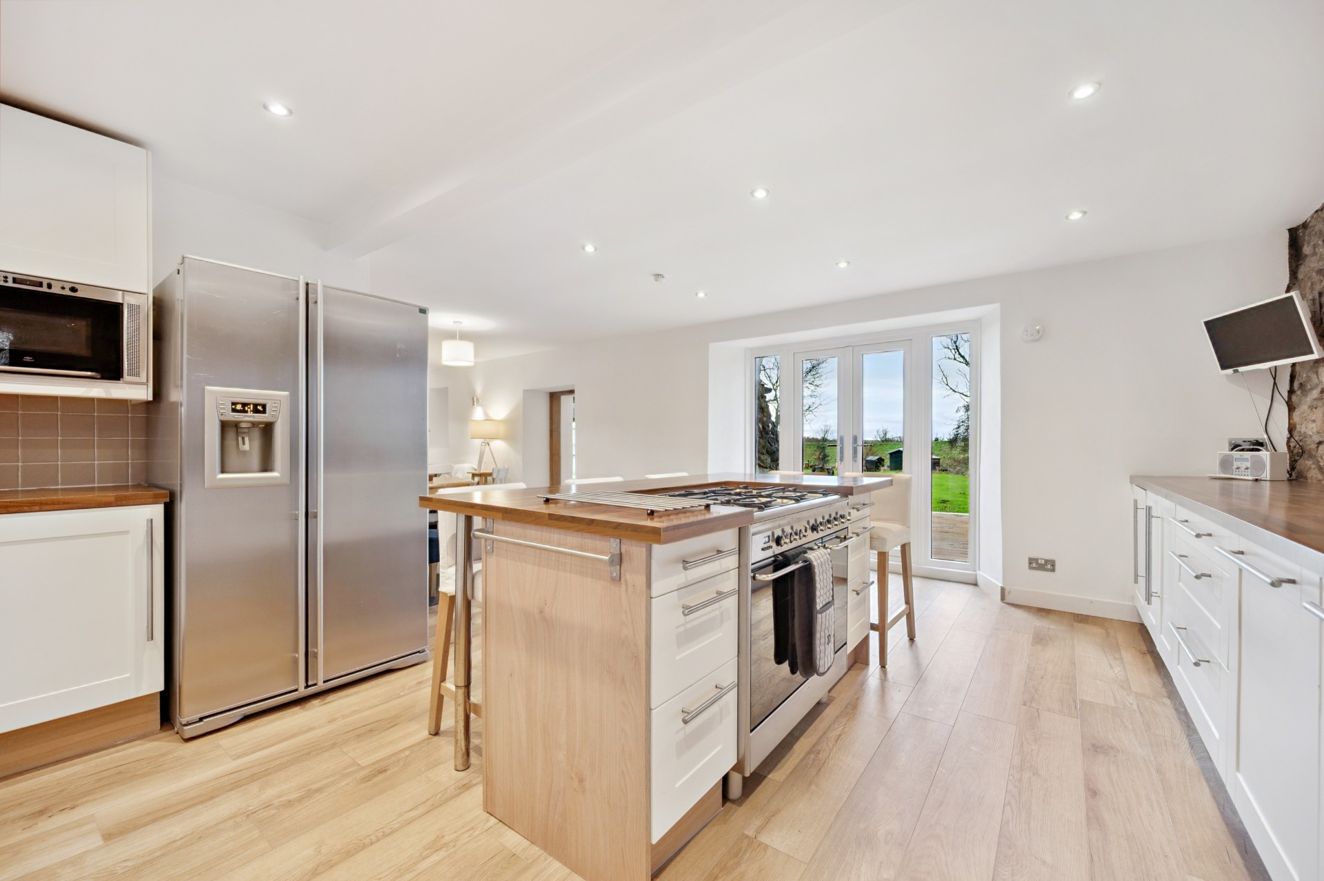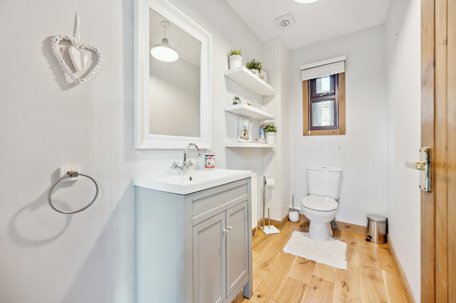 Internally, the accommodation begins on the ground floor with a welcoming entrance porch leading into a large and inviting living room, with a utility room and bathroom located just off. This flows through to a generous reception area, perfectly suited for dining and informal lounging. The substantial kitchen boasts a modern finish while thoughtfully retaining the property’s original barn-style character. A further W.C. completes the ground floor.