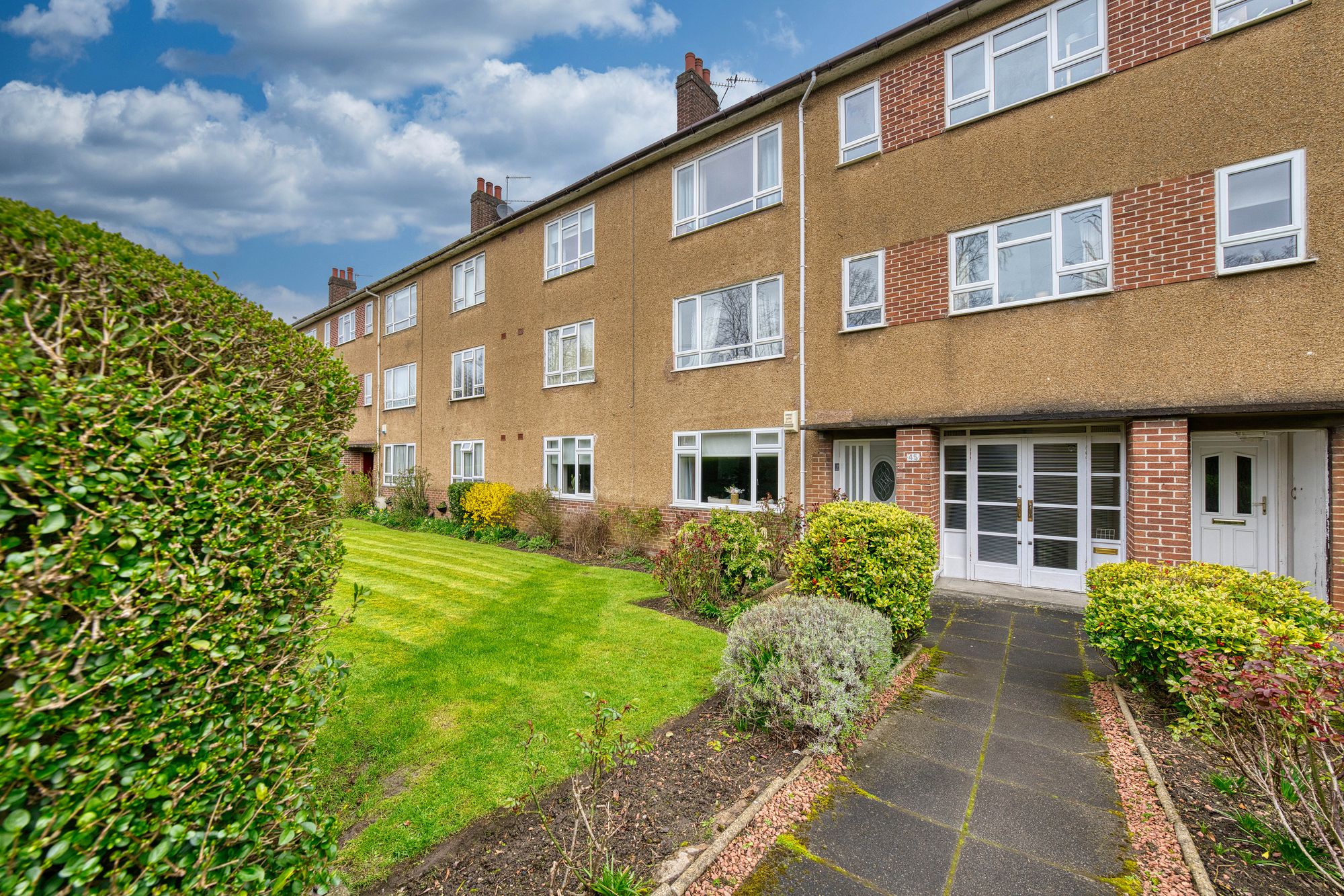 The property is set within an impressive blonde sandstone tenement. The building benefits from a secure entry system. To the rear, residents enjoy access to communal gardens laid to lawn, along with a designated drying area and refuse storage.