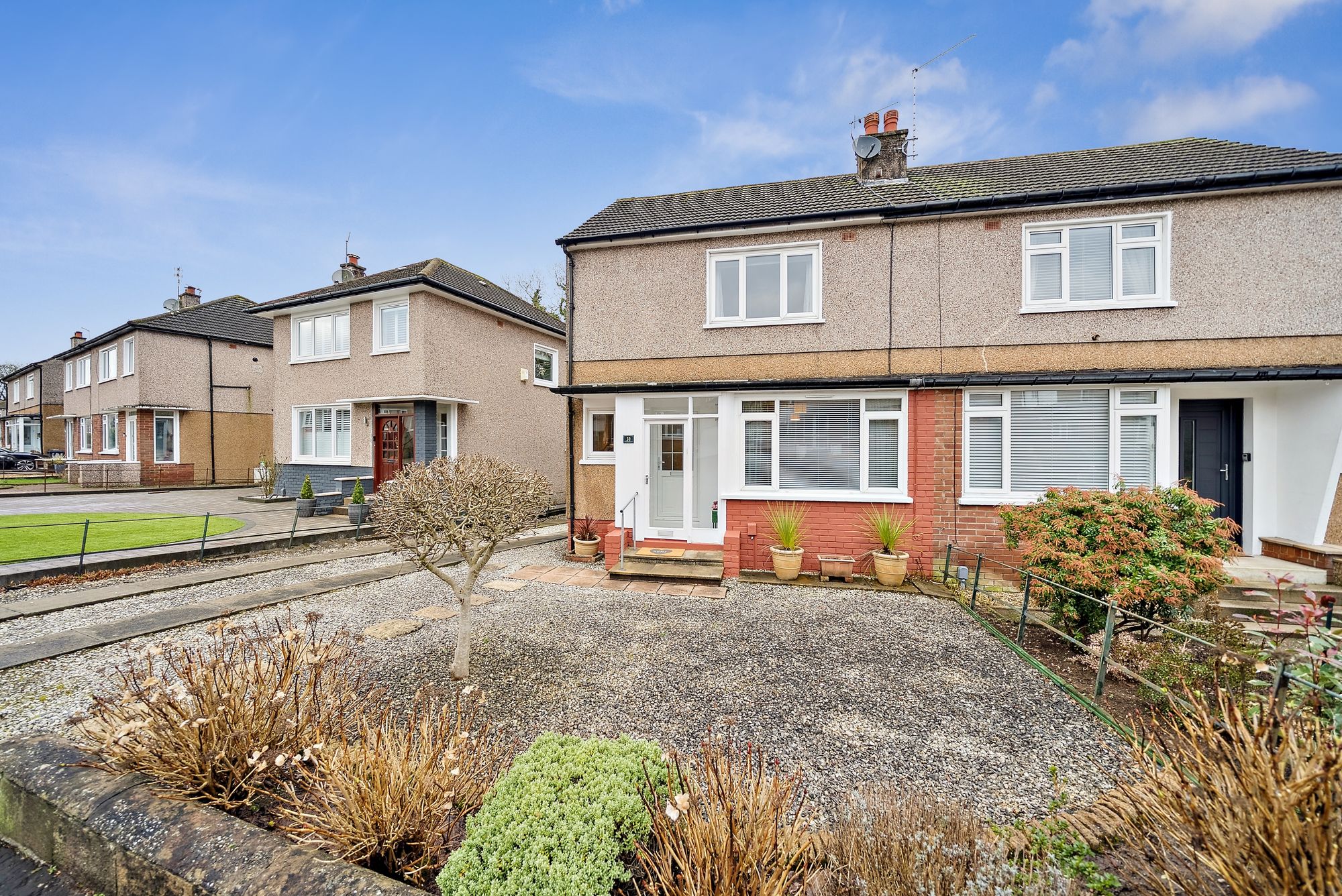 A pathway leads to Drymen Road, where a regular bus service provides easy access to Bearsden Cross and Glasgow city centre. Bearsden Cross offers a comprehensive selection of amenities including a Marks & Spencer Food Hall, a variety of shops, restaurants, coffee shops and a doctors’ surgery. Nearby leisure facilities include golf and bowling clubs, while Bearsden Station, located just beyond the Cross, provides frequent rail services to both Glasgow and Edinburgh.