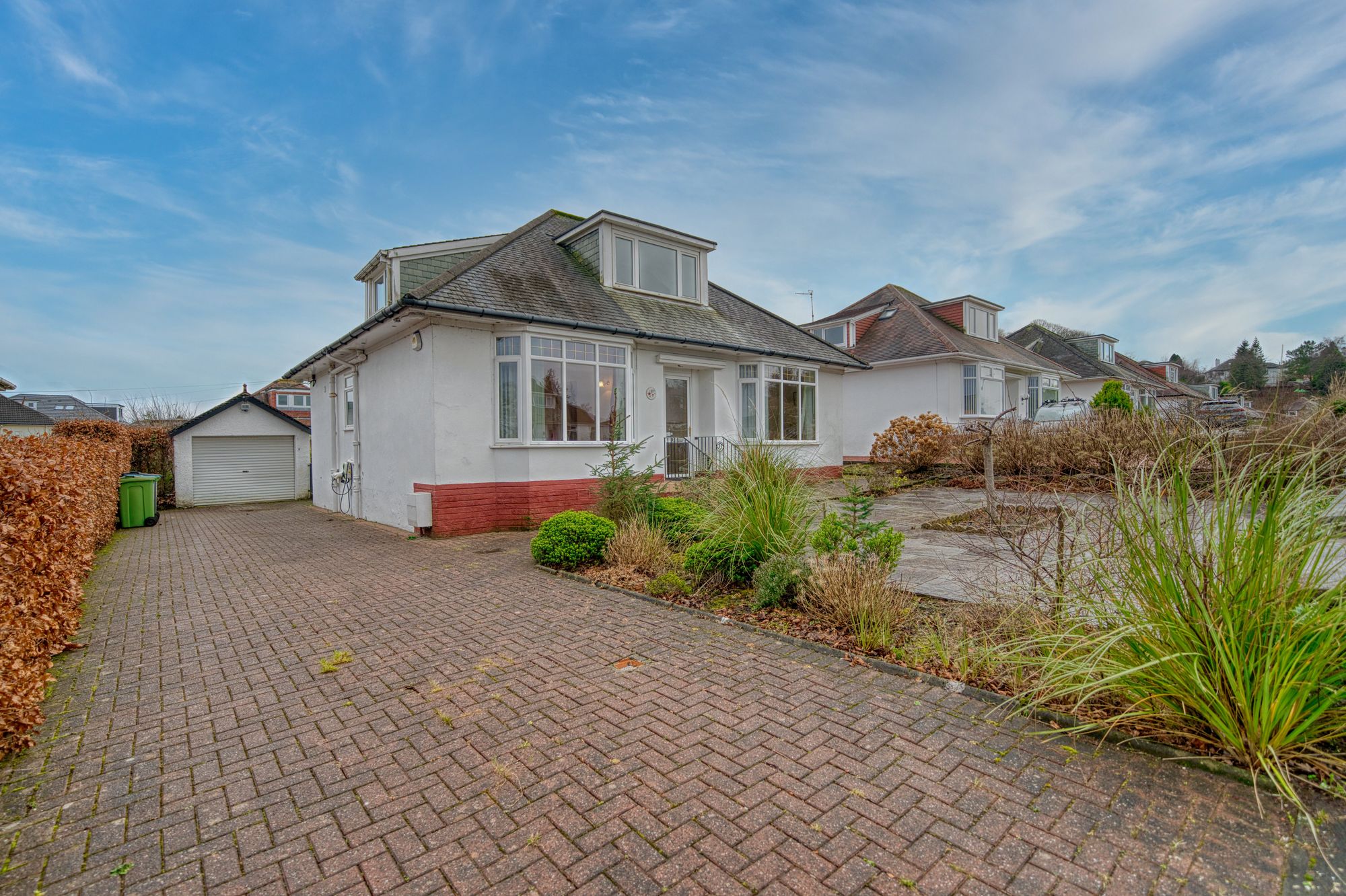 The property commands a vast plot with extensive driveway parking to the front and a detached garage. The rear garden comprises sweeping areas of lawn, mature bushes, shrubs, plants and trees and is accompanied by a large area of decking. Given the size of the plot, there is fantastic potential for extension to side to create a generational family home and take advantage of living in Glasgow’s sought after Southside.